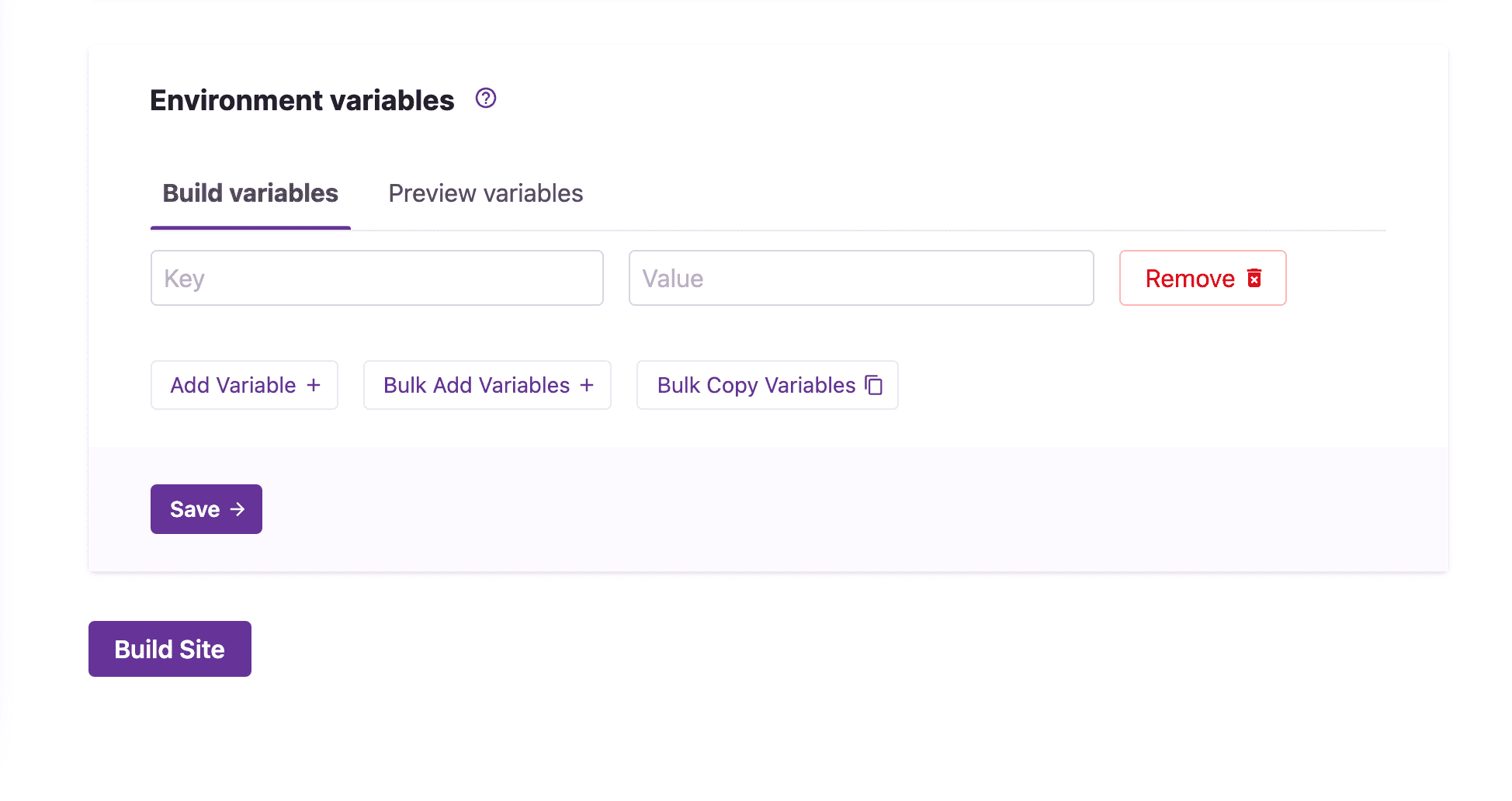 Now, you will be asked to set up environment variables for your site. The “Default” starter does not use any environment variables so you will skip this step as well. Click “Build Site” to continue.