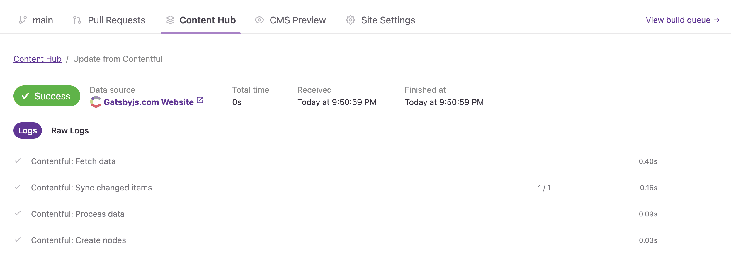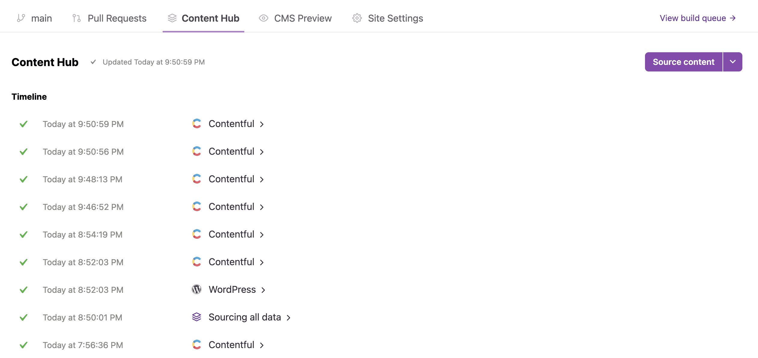 1. In your Gatsby Site on Gatsby Cloud, click on the Content Hub tab. This will contain a list of all the sourcing events for your Content Hub. Screenshot of the Content Hub overview. It's a list of sourcing events for different CMS and their respective status. Kind of like the build overview.