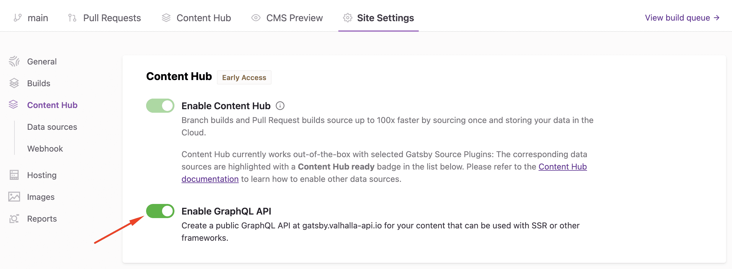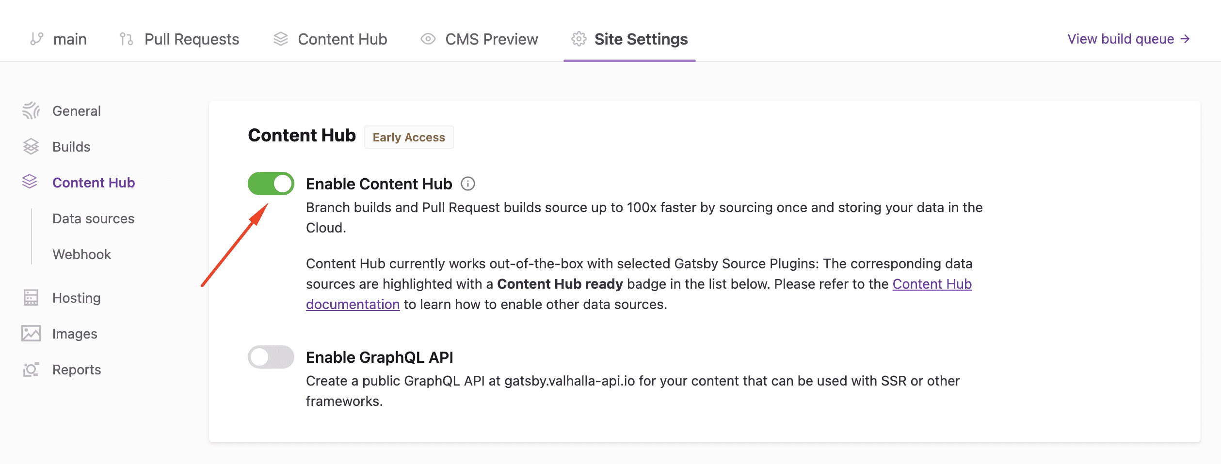 2. Click the Enable Content Hub for all builds toggle to enable the feature. This will create a Valhalla Content Hub instance and begin sourcing content for supported source plugins. Screenshot of the Site Settings page showing where to find the toggle. Follow the steps above to enable it.