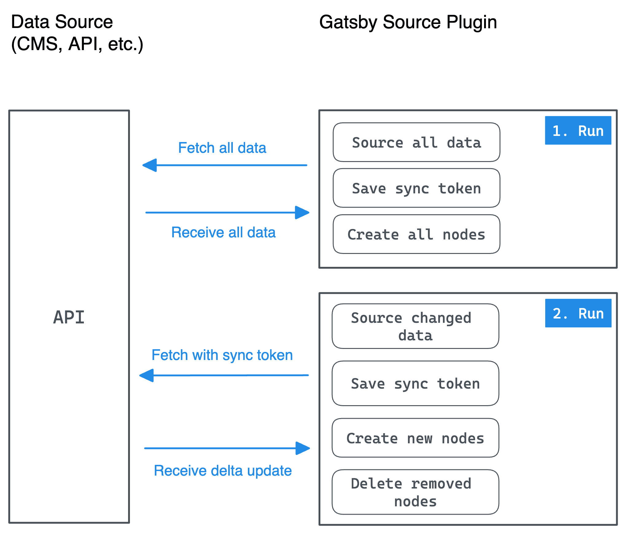 touchNodeAPI to tell Gatsby to keep existing GraphQL nodes around during garbage collection. - Most APIs use a sync token that you need to send along the request to the API to receive a delta update.